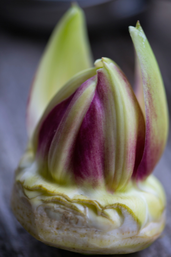 Trim artichokes using a serrated paring knife till all the outer leaves are removed and there are no more bitter dark green spots. Cut the top off just above the bottom and use a teaspoon to scoop out the choke.